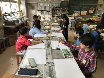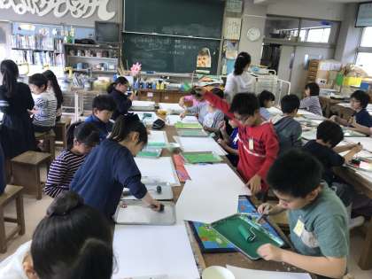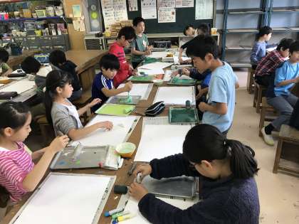 4/16 図工の学習スタート 公開日 2018/04/17 更新日 2018/04/17 学年 5年生は今週から、専科の学習が始まりました。忘れ物ゼロでスタートした初日。図工の山口先生と初めての授業です。山口先生から「用賀小学校のみんなと初めての時間で楽しみです。」と自己紹介があり授業がはじまりました。 好きな色の絵の具を選び、ローラーをつかって画用紙に色をつけていきます。きれいにグラデーションになっている部分をいかして作品づくりにいかすことができました。これからの授業が楽しみです。