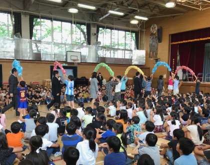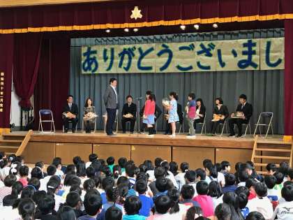 新年度が始まって1ヶ月。なつかしい先生方の顔ぶれに、えがおいっぱいの離任式が行われました。給食が終わったころから、こどもたちもソワソワドキドキした様子。