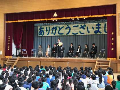 体育館に集合し、先生方の姿を見ると拍手や歓声もよりいっそう大きくなりました。感謝の気持ちをこめて、代表児童が手紙を読みました。花束と文集のプレゼントを渡す代表も、緊張した面持ちながらうれしそうにしていました。その後先生方から、一言ずつお話がありました。「用賀小学校はすてきな場所ですよ。」「これからも頑張ってくださいね。」と心温まるお言葉をいただきました。