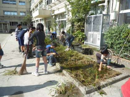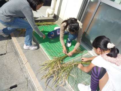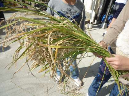 11/5 5年生稲刈り 公開日 2010/11/05 更新日 2010/11/05 校長室より 5年生1組は用賀小の田んぼで稲刈りをしました。田の稲穂もだいぶ頭を垂れて黄金色になっていました。クワを使っての稲刈りです。刈りたい稲を一束ずつ持ち、クワで稲を奥の方から手前に引き、できるだけ下の方を刈っていました。刈った稲は3束くらいを一つに束ね乾燥させ、数週間干したあと脱穀して玄米にします。精米したお米は、実習で調理して食べる予定です。用賀小の田んぼで育てたお米。どんな味がするのか楽しみです。