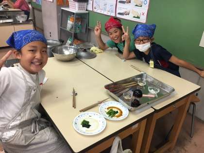 「青菜をゆでよう!!」という学習で、ほうれん草のごま和えと、小松菜のおひたしを作りました。