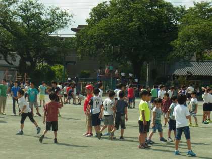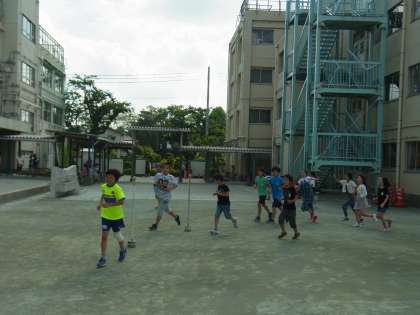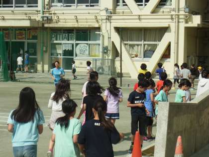 6月になり、朝から暑い日が続いています。8時5分のチャイムが鳴ると、全校児童が教室に入り、朝の準備をします。そして高学年の児童は朝ランニングを始めます。友達と声をかけ合いながら、自分の体力を高めるためにがんばっています。また中学年、低学年の児童も急いで朝の準備を済ませ、校庭で元気に遊んでいます。