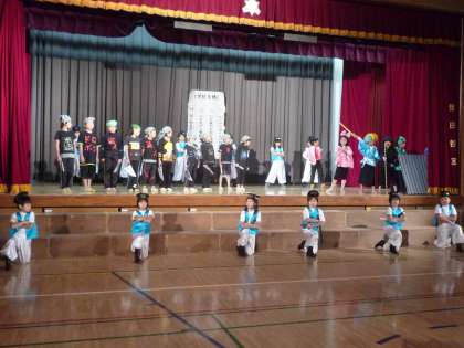 3年生は「どろぼう学校」です。喜劇ですので、楽しい動きやボケる場面を子どもたちがアレンジして挑戦しています。表情も引き締まって真剣そのものです。