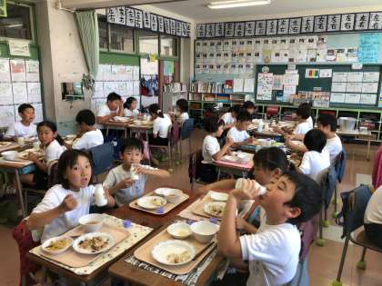終わった後の給食では、牛乳のラベルを見て