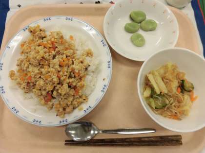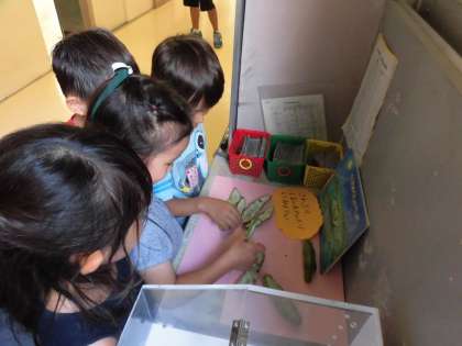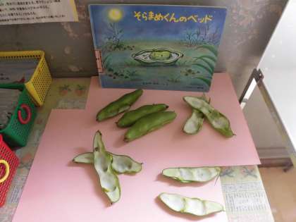 今日は、給食で使ったそら豆のさやを、給食室の前に展示しました。クラスによっては、絵本「そらまめくんのベッド」の読み聞かせをしてから、そらまめのさやを触っていて、子供たちは「絵本通りにふかふかしている」「まめの匂いがする。」など実際のさやの感触を楽しんでいました。