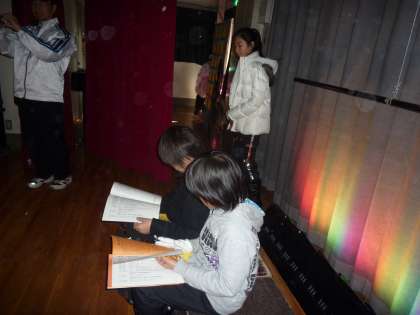 1枚目は2年生が出番を待っています。2枚目は3年生が遠藤菜穂子先生から、最後の言葉を掛けてもらっています。3枚目は6年生の照明係の子どもが台本を再確認しています。緊張感いっぱいの舞台裏のようすが少しでもおわかりいただけましたか?