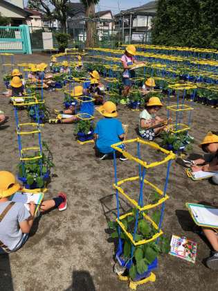 梅雨の合間の晴れ、子どもたちは朝から元気に活動していました。朝顔も、つかの間の晴れ模様を楽しむかのようにぐんぐん成長!