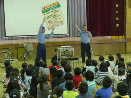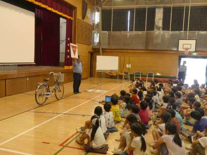 自転車教室を行いました。前日に降った大雨から校庭の使用が出来ず、残念ながら体育館で映像を見る学習だけとなりました。