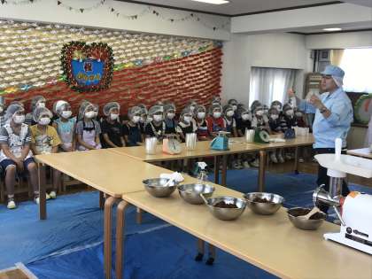 4年生の時にしこみをしたみそ。昨年度に引き続き、農大古庄先生たちのご指導の下、今日は最後の仕上げ作業をしました。