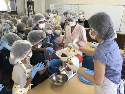 みそをこした後、重さを量りパックづめ。たくさんの保護者のみなさまにもお手伝いいただきました。みその良い香がただよう中作業をしました。