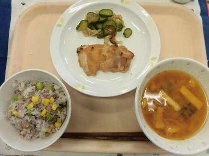 今日は、今日の給食に使った「夏野菜」のクイズを出したいと思います。今日の給食に使った夏野菜は、全部でいくつでしょうか?
