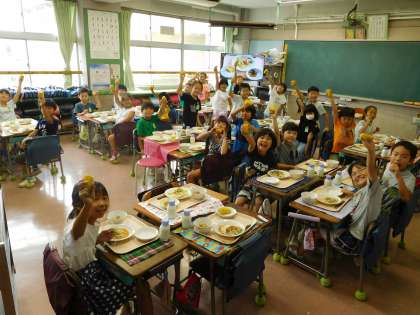 そして、給食の時間には2年生が皮むきをした