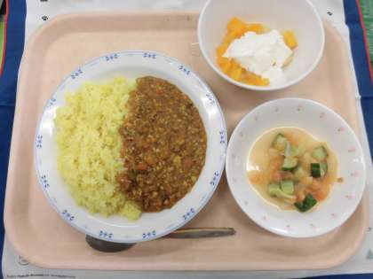 毎月19日は、食育の日です。今月の19日は給食がないので、今日の給食を食育の日の献立にしました。食育の日には、「給食で世界を飛び回ろう!〜東京オリンピック・パラリンピックに向けて、世界各国の料理に触れよう〜」ということで、いろいろな国の料理を出しています。今日は、用賀中学校の栄養士さんが今日の献立を考えてくれました。