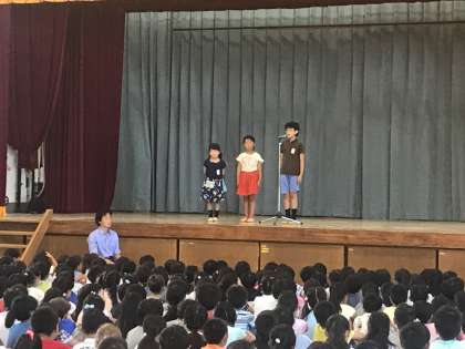終業式では、1.3.5年生の児童代表が1学期できるようになったこと、成長したことを中心に堂々と話すことができました。前を見て、しっかりと自分の思いを語ることができ、とても立派でした。