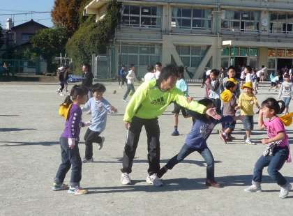 学芸会が終わって、秋晴れの校庭には、先生と一緒に遊ぶ子供たちの笑顔がいっぱいです。
