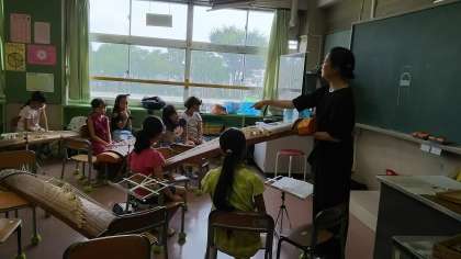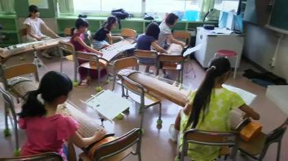 今日はみんなで「さくらさくら」をお箏で演奏しました。基本的に隣の弦を順番にはじくと演奏できるようになっており、初心者にぴったり!つける爪は四角い生田流。楽譜もたてに読み、漢数字がふってあります。いつもとはちがう読み方でしたが、みんな上手に弾けていました。