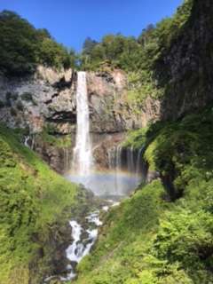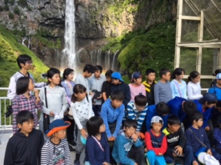 いろは坂を過ぎ、華厳の滝で集合写真を撮りました。虹が現れ、大歓声があがっています。