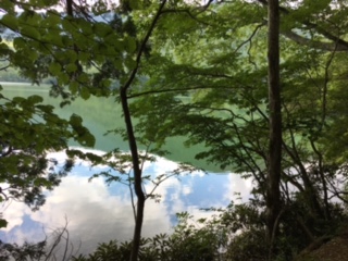 湯の湖の水面には美しい山々と青い空、白い雲が写っていました。
