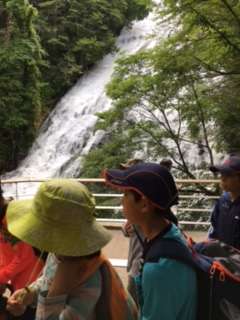 ひらけたところに出ると湯滝を間近に見ることができました。下はどうなっているの?と興味津々です。湯滝をバックに写真撮影です。