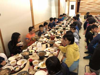 最後の夕食ではこれまでの食事の反省を生かすことができました。食事係は自分たちで声をかけあって集まったり、助け合って素早く準備をしたりしました。全員が5分前行動を意識することができ、定刻2分前に「いただきます」を行うことができました。そのため、ゆったりとご飯を食べることができ、たくさんの子供だちがおかわりをしていました。