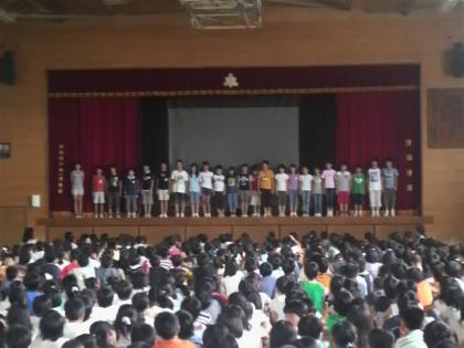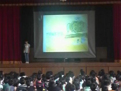 集会の時間に図書委員会のメンバーによる読み聞かせがありました。大きなスクリーンに図書委員会の皆がていねいに写し描いた絵を映し出し、セリフをマイクを使わずに大きな声で言いました。絵本の名前は「キャベツくん」です。