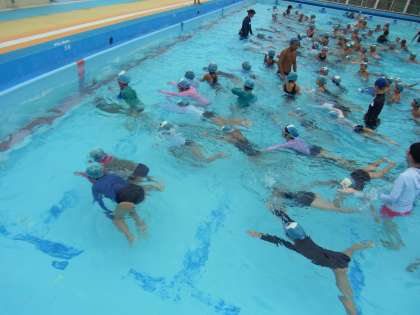 先週の猛暑も落ち着き、涼しい気候の中で夏期水泳指導の最終日を迎えました。夏休みの間、自分の目標に向かってプールにたくさんの児童が参加していました。