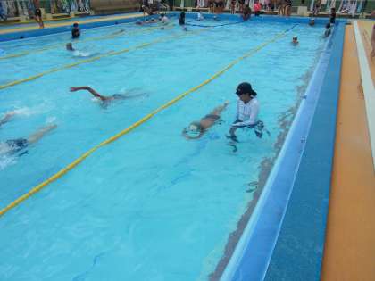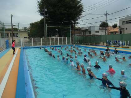 高学年の部は、少し晴れ間が見えた中で行われました。6年生にとっては、夏のプールが最終日です。これまで学習したことを思い出しながら、水慣れをしました。5,6年生ともに運動会の表現運動「南中ソーラン」をプールの中で踊りました。陸上では腰を落とすこともできたのが、水の中だとなかなか腰が落ちず、水の中での動きの難しさを改めて感じることができました。