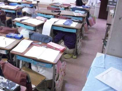 4年生は避難訓練後に起震車体験をさせていただきました。震度7までの揺れを体験しましたが、しっかりとテーブルの柱につかまっていないと吹っ飛んでしまいます。おへそを見るようにして頭を低くするなど、命を守る方法を教えていただきました。