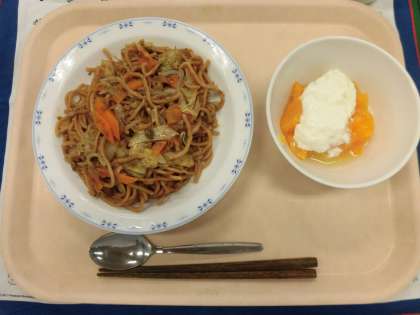 今日の給食は、「ソース焼きそば」です。給食の焼きそばには、野菜をたくさん使っているので、栄養満点です。そこで今日は、「野菜」のクイズを出したいと思います。野菜は、1日にどれくらい食べるとよいと言われているでしょうか?