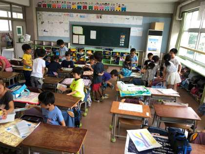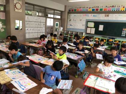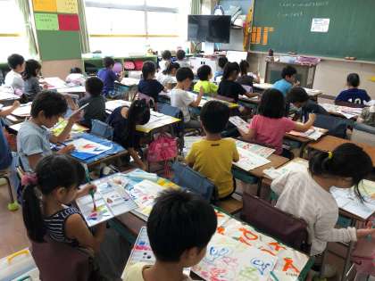 9/13 1年 絵の具の練習 公開日 2018/09/15 更新日 2018/09/14 学年 2学期になって2週間。学校生活にも慣れてきた1年生は、絵の具を使ってみました。パレットの持ち方やバケツを置く位置、水の汲み方等、実際に行ってみました。 準備ができたらお絵描きタイム♪今日は水を混ぜてみたり、色を混ぜてみたりしながら絵の具にふれあいました。 片付けもしっかりやった1年生。次回以降、素敵な作品を作る事が楽しみです。