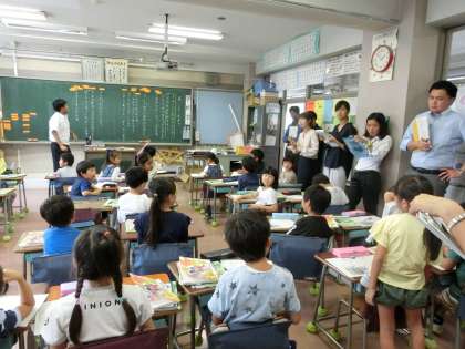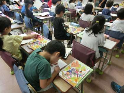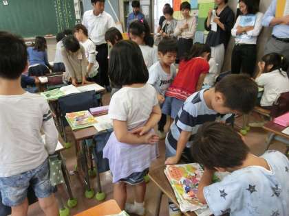 主人公のモールくんの言葉の裏にある気持ちに焦点をおいて物語を読んでいくために、ワークシートを活用しました。始めにワークシートに自分の考えを書き、その後、友達の書いたものを見に行きます。考えが変わればワークシートを書き直したり、書き足したりもします。発表の場面では手を挙げる子が多く、水井先生の言葉にのせられて活発に考えを発表し合う姿がみられました。たくさんの大人たちに囲まれて緊張をしたと思いますが、子どもたちはとても意欲的に学習をしていました。