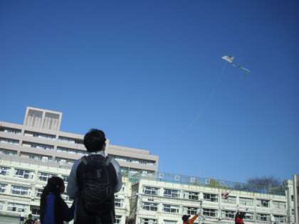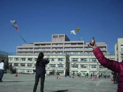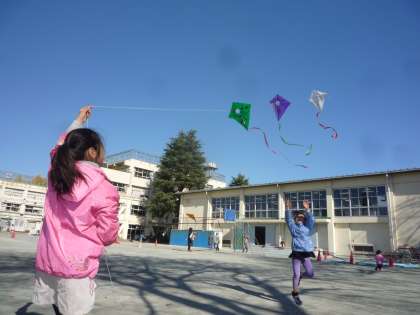 手づくりの凧を青空に向けて高々とあげ、校庭は子どもたちの笑顔でいっぱいでした。今日は、図工の坪谷美帆先生も一緒に手伝ってくれました。スタッフの皆さん、早朝からありがとうございました。来年も宜しくお願いいたします。