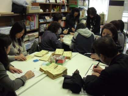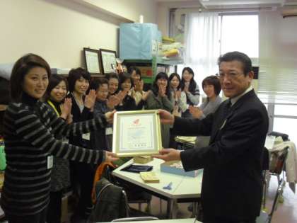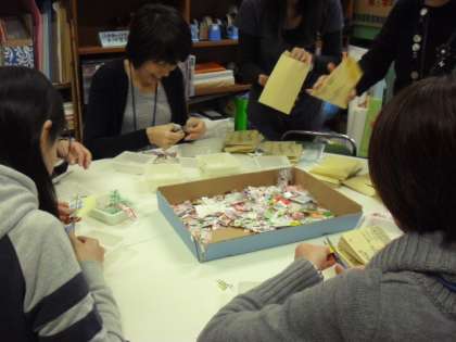 今日はベルマークが、これまでの累計で300万点を突破したということで、ベルマーク教育助成財団から表彰状をいただきました。また、ベルマーク教育助成財団のホームページ1月号に「ベルマーク用賀」の特集をしたいということで取材が入りました。昨年は14万点が集まり東京都で10位に入りましたが、毎年のように多く集めるコツを取材していきました。