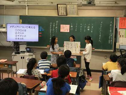 9/25 5年 国語 メディアについて考える 公開日 2018/09/25 更新日 2018/09/25 学年 グループに分かれ、調べたことを発表しました。それぞれのメディアについて、メリットとデメリットを踏まえて伝えることができました。 各グループの発表を聞いた後、共通点を見いだしながら感想を伝える姿も見られました。情報にあふれている今の社会。上手な付き合い方ができるように、考える機会となりました。