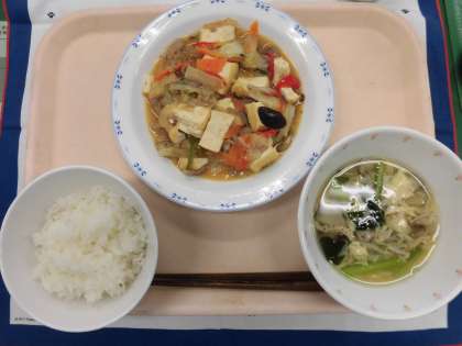 今日は、「厚揚げと豚肉のみそ炒め」に使った、「厚揚げ」のクイズを出したいと思います。厚揚げは、ある食べ物を油で揚げて作っています。さて、次のうちのどの食品を揚げると厚揚げになるでしょうか?
