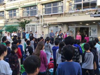 司会の人達が堂々と話し、出発式を行いました。全員がそろい、いいスタートをすることができました。朝早くから大勢のお見送り、ありがとうございました!行ってきまーす!
