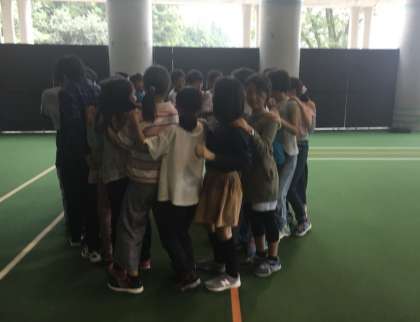 クラスごとに輪になり完成すると「できたー!」の声が響きました。