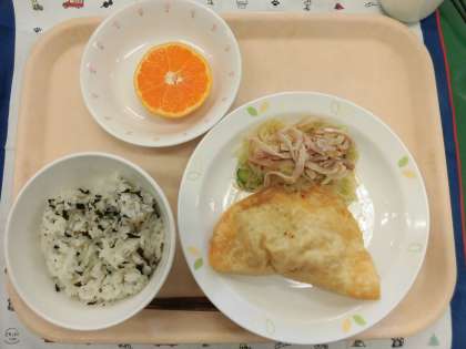 今日の給食は、「ジャンボぎょうざ」です。そこで今日は、「ぎょうざ」のクイズを出したいと思います。ぎょうざはもともと、中国で作られた料理です。中国でよく食べられているのは、何ぎょうざでしょうか?
