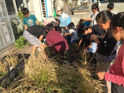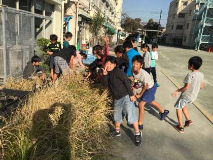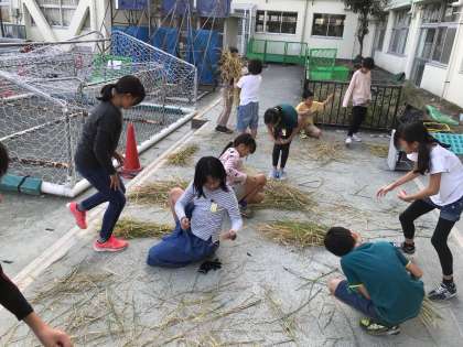 10/30 5年 稲刈り 公開日 2018/10/31 更新日 2018/10/31 学年 実りの秋! 裕介先生のご実家から送っていただいた稲も収穫の時をむかえました。放送室の前で成長を見守り続けた稲を次々に刈り取り束ねました。鳥に食べられてしまった分もありますが、それだけおいしいということかな…一粒一粒大事に集めました。 しばらくの間、教室で干します。川場の村めぐりでも見た光景だねと話しています。