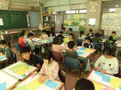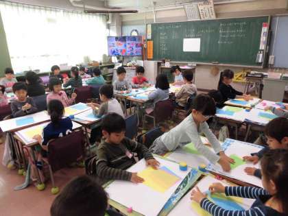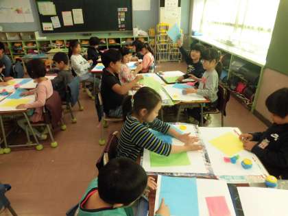 今日の図工はお花紙を使っての学習です。柔らかい紙を、ちぎる、丸める、重ねる、包む……。様々な方法で形を作りました。