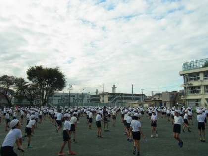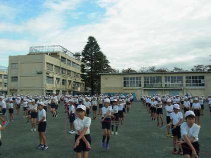 11/7 高学年 短縄朝会 公開日 2018/11/08 更新日 2018/11/08 学年 本日は、高学年の短縄朝会が行われました。運動委員会が前でお手本を示しながら、音楽に合わせて跳んだり、様々な技に挑戦したりしました。二重跳びや、返し跳びなどにチャレンジして、「あとちょっとでできる!」や、「できた!!」という声が聞こえてきました。 寒くなってきましたが、休み時間は元気に外で遊び、短縄にもたくさん取り組んでほしいと思います。