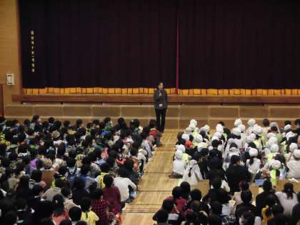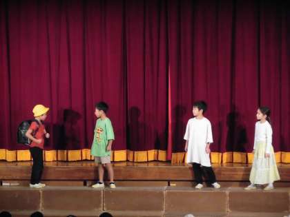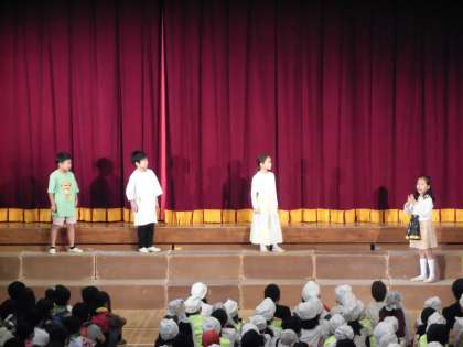 2年生代表児童による「はじめの言葉」は、各学年の劇が楽しみになるような出し物をでした。