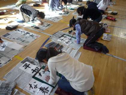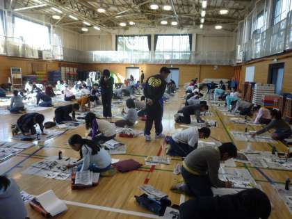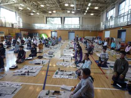 1/14 6年生席書会 一心不乱な姿が立派です 公開日 2011/01/14 更新日 2011/01/14 校長室より 今日は6年生の席書会です。全員で黙想をして、しっかりと心を落ち着けてから書き始めます。体育館の中はシーンと張り詰めた空気で、私語は一つもありません。一心不乱に書き続けています。心を一つのことに集中して、他のことに気をとられないその姿は、さすがに用賀小学校の6年生です。とても立派な姿勢でした。