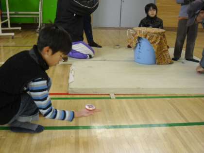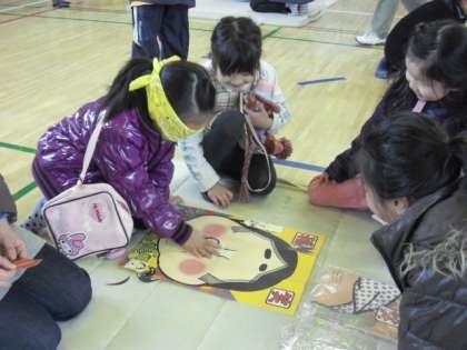 1月のふれあい広場は昔遊びです。体育館では、福笑、こま回し、べーごま、すごろく、けん玉、校庭では、竹馬、羽子板など、私たちが昔遊んだ遊びがいっぱいです。保護者の方々や、おやじの会の方がていねいに教えてくださり、子どもたちは、寒い中でも笑顔がいっぱいでした。