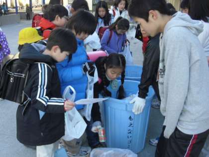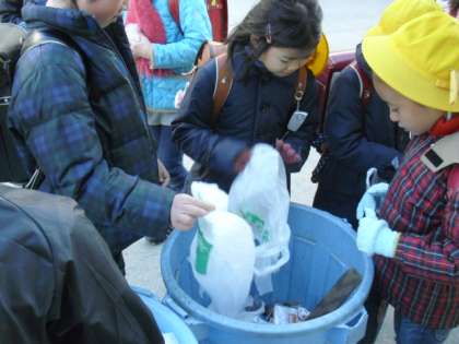 校門を入ると、運営委員の子どもたちが、笑顔で分別のお手伝いをしてくれています。「ありがとう。捨ててあげるよ」と、とても微笑ましい光景で、朝からうれしい気持ちでいっぱいになりました。