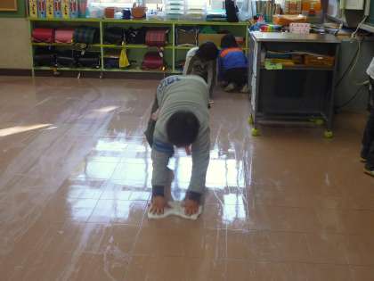3年生の無言清掃がとても上手です。一心に教室の床のぞうきんがけに取り組んでいる子や、黒板をきれいにしている子、ほうきを上手に使っている子など、どの子からもおしゃべりが聞こえません。もちろん先生も一緒です。