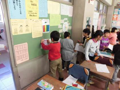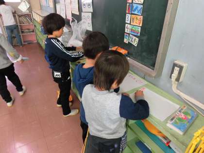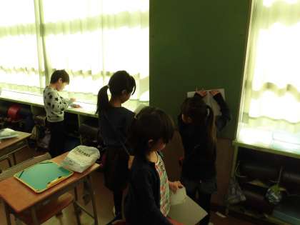 紙を床や棚、外のコンクリートなどに置いて、クレパスで塗る擦り出しです。教室から飛び出し、後半は学校中をそれぞれ回りました。下に何があるかで様々な模様が出来上がっていました。