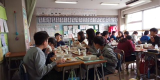 次にアメリカの子供たちの学校生活の動画を見ました。日本は給食だけれど、アメリカはお弁当や食堂で食べることを知り、興味津々でした。