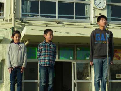 また今日は2、4、6年生の児童による代表の言葉の発表がありました。冬休みにたくさん練習して、2学期にがんばったことを更に伸ばし、3学期で取り組んでいきたいことを大きな声で発表することができました。