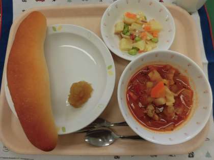 毎月19日は、食育の日です。今月は、19日がお休みなので、今日の献立を食育の日の献立にしました。食育の日には、「給食で世界を飛び回ろう!〜東京オリンピック・パラリンピックに向けて、世界各国の料理に触れよう〜」ということで、いろいろな国の料理を出しています。クイズです。今日の献立は、どこの国の料理でしょうか?